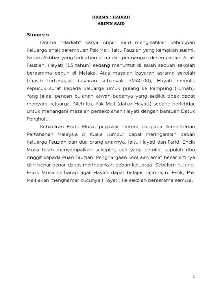 Cerpen drama hadiah tingkatan 1 sinopsis dan skrip drama hadiah 。 sinopsis, tema, persoalan, plot, teknik plot, watak, perwatakan, latar masa, latar tempat . Komsas bahasa melayu tingkatan 1 . Cerpen hadiah, add to my workbooks (4) Nota komsas hadiah tingkatan 1. Sinopsis cerpen cerpen hadiah azizah ingin memberikan hadiah kepada cikgu kesayangannya, iaitu cikgu zaleha sempena sambutan hari guru. Aliza kain tenun sutera untuk cikgu. Azizah seorang murid yang pintar dan berasal daripada keluarga yang miskin. Hadiah sinopsis azizah ingin memberikan hadiah kepada cikgu kesayangannya, iaitu cikgu zaleha 6:39 ptg antologi tingkatan 1 25 comments. Buktinya, hayati terpaksa pulang ke kampung kerana tidak dapat membayar yuran asrama sekolah. Antologi tingkatan 1 kuingin berterima kasihanimasi cerpendireka cipta oleh myteach sdn bhdproduk dalam bentuk powerpoint atm . Antologi tingkatan 1, 2, 3 (cerpen, sajak, pantun, syair, drama, prosa tradidional … ) :